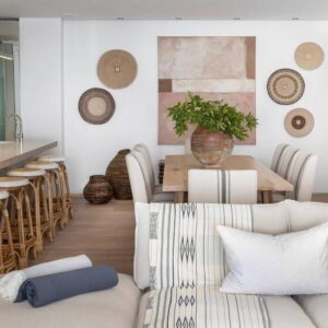 The Nautilus apartment offers two en-suite bedrooms with king size beds and a third en-suite bedroom with two bunk beds, ideal for children. The open-plan kitchen seamlessly transitions into the living and dining areas, featuring an 8-seater dining table, TV snug, relaxed seating, and sun beds with sea views. Opening onto a covered terrace the apartment effortlessly merges indoor comforts with outdoor living.